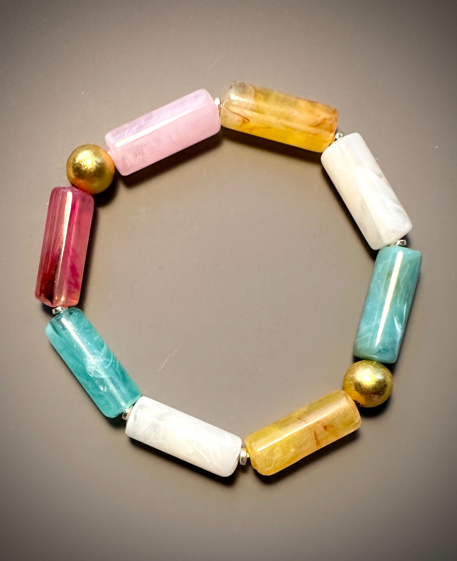 Stilet og farverigt armbånd med elastik. Perlerne er cylinderformet og lavet af genbrugsplast. Samt enkel lille guldbelagte hematit perle. Armbåndene kommer i to størrelser s/m og m/l